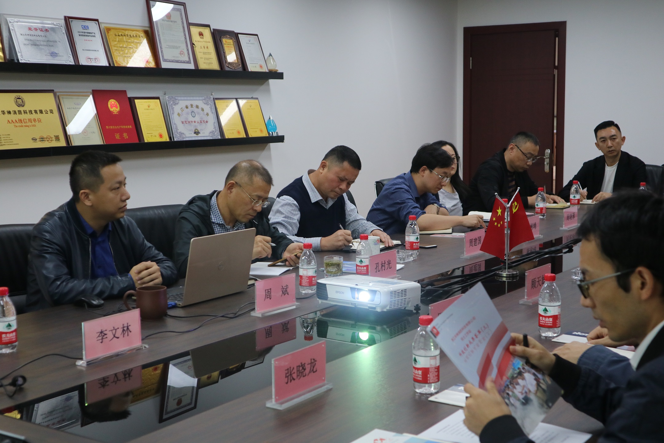 國(guó)網(wǎng)國(guó)網(wǎng)浙江省電力公司、國(guó)網(wǎng)浙江電科院一行參觀了華神的榮譽(yù)長(zhǎng)廊、公司展廳,華神消防總經(jīng)理周斌對(duì)公司概況、組織架構(gòu)、自主研發(fā)的消防系列產(chǎn)品、院士工作站、公司發(fā)展前景等逐一介紹,調(diào)研組仔細(xì)聆聽(tīng),認(rèn)真記錄,不時(shí)提出疑問(wèn)。